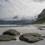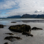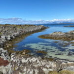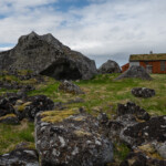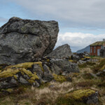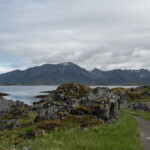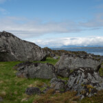 Wir haben am Sunnlandsfjord geparkt und sind auf einem breit angelegten Weg am Meer entlang gewandert, vorbei an riesigen Felsblöcken, verstreut in sumpfigem Grasland, blühenden Moltebeeren, Hütten mit Moosdächern.