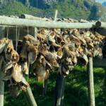 Es ging durch einige Tunnels, vorbei an immer wilderen Bergen wie aus einer Phantasiewelt, an den berühmten Gestellen mit Trockenfisch, bis wir zuletzt an der Reine-Brücke anhielten, um das Lofoten-Standard-Foto zu machen, mit den roten Fischerhütten auf dem felsigen Boden und dem gewaltigen zweigeteilten Berg dahinter.