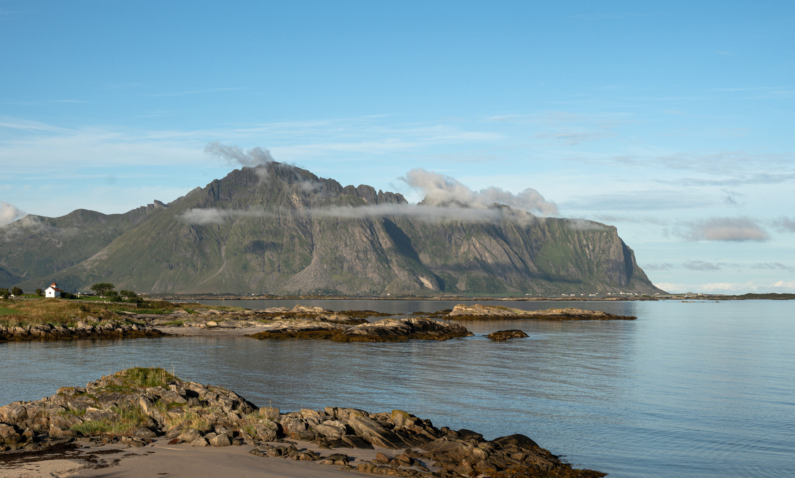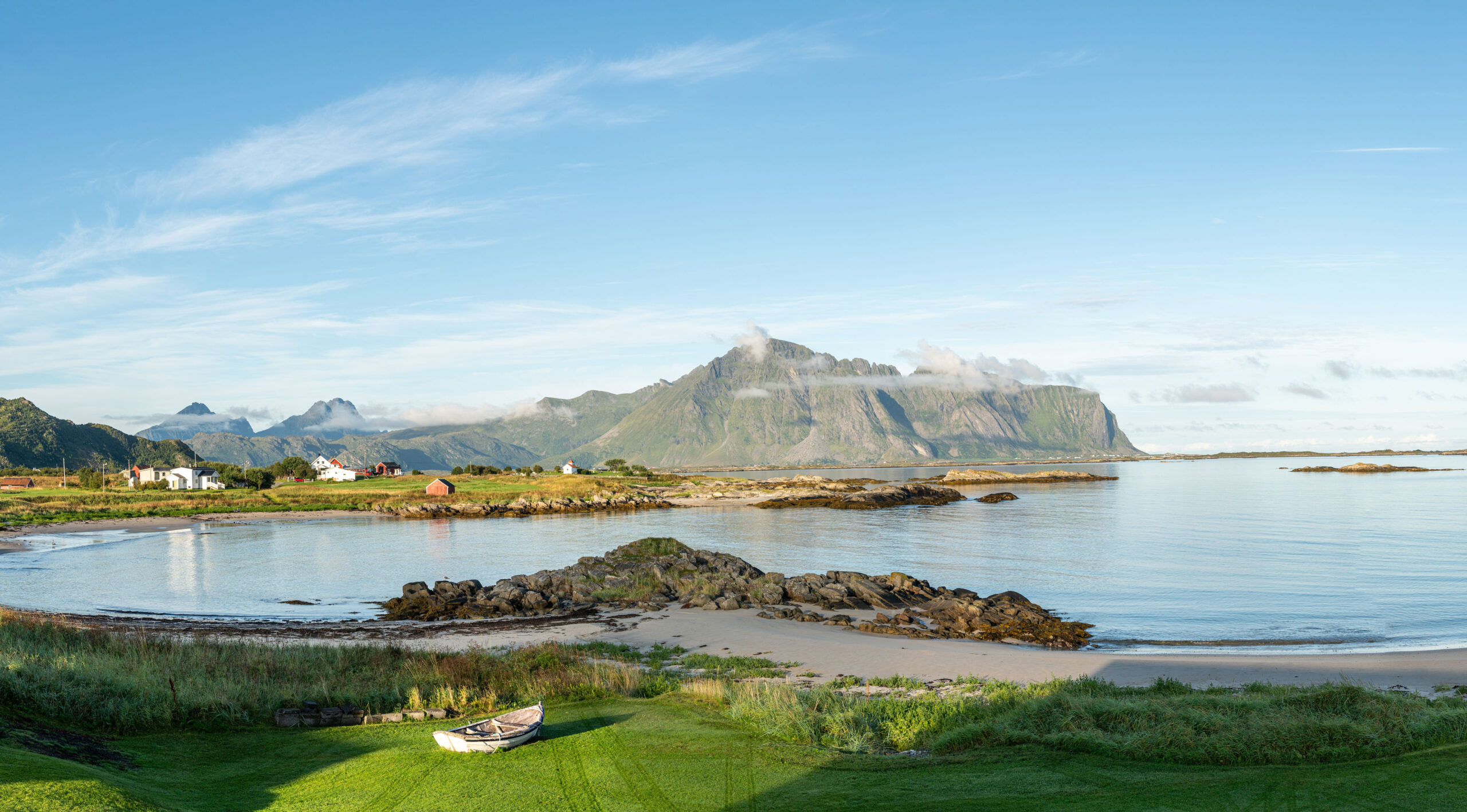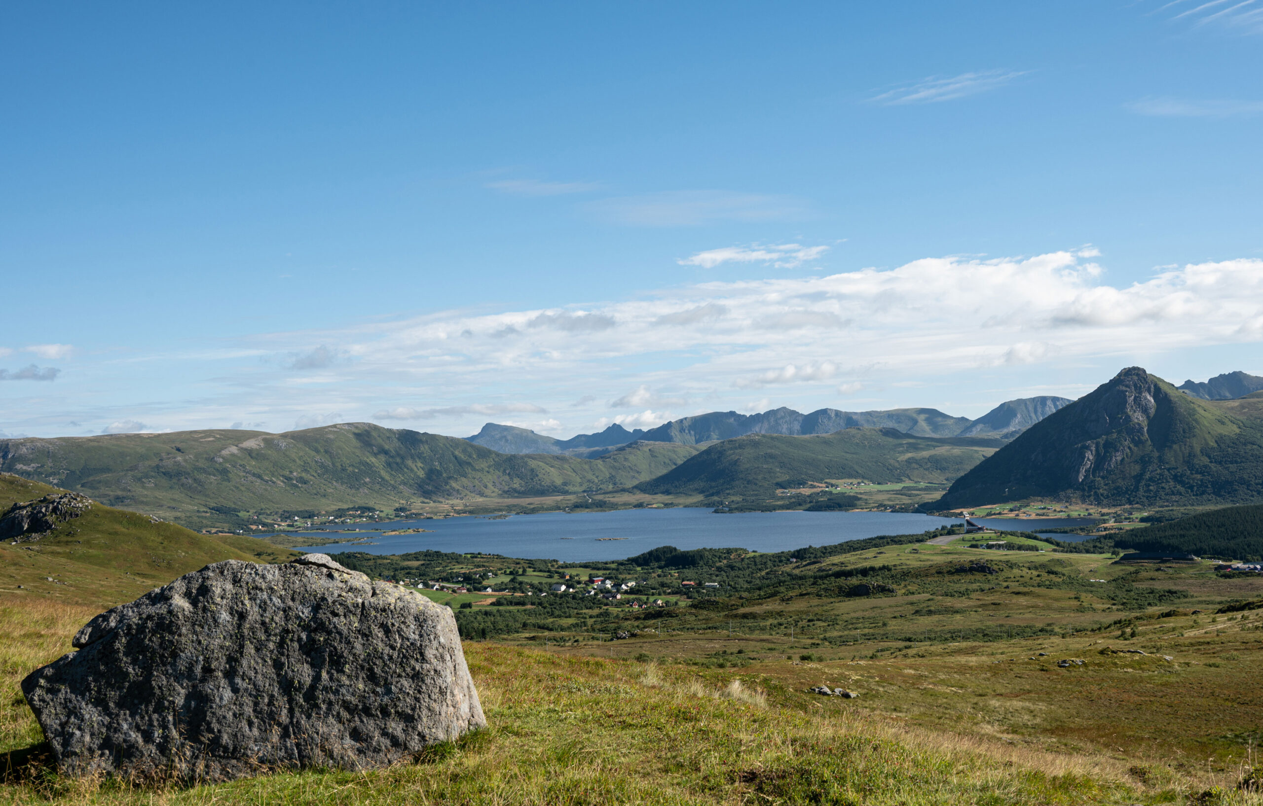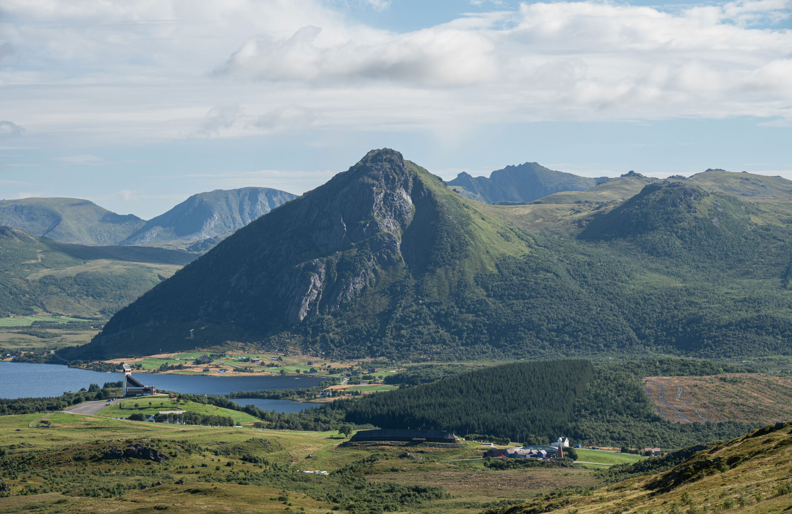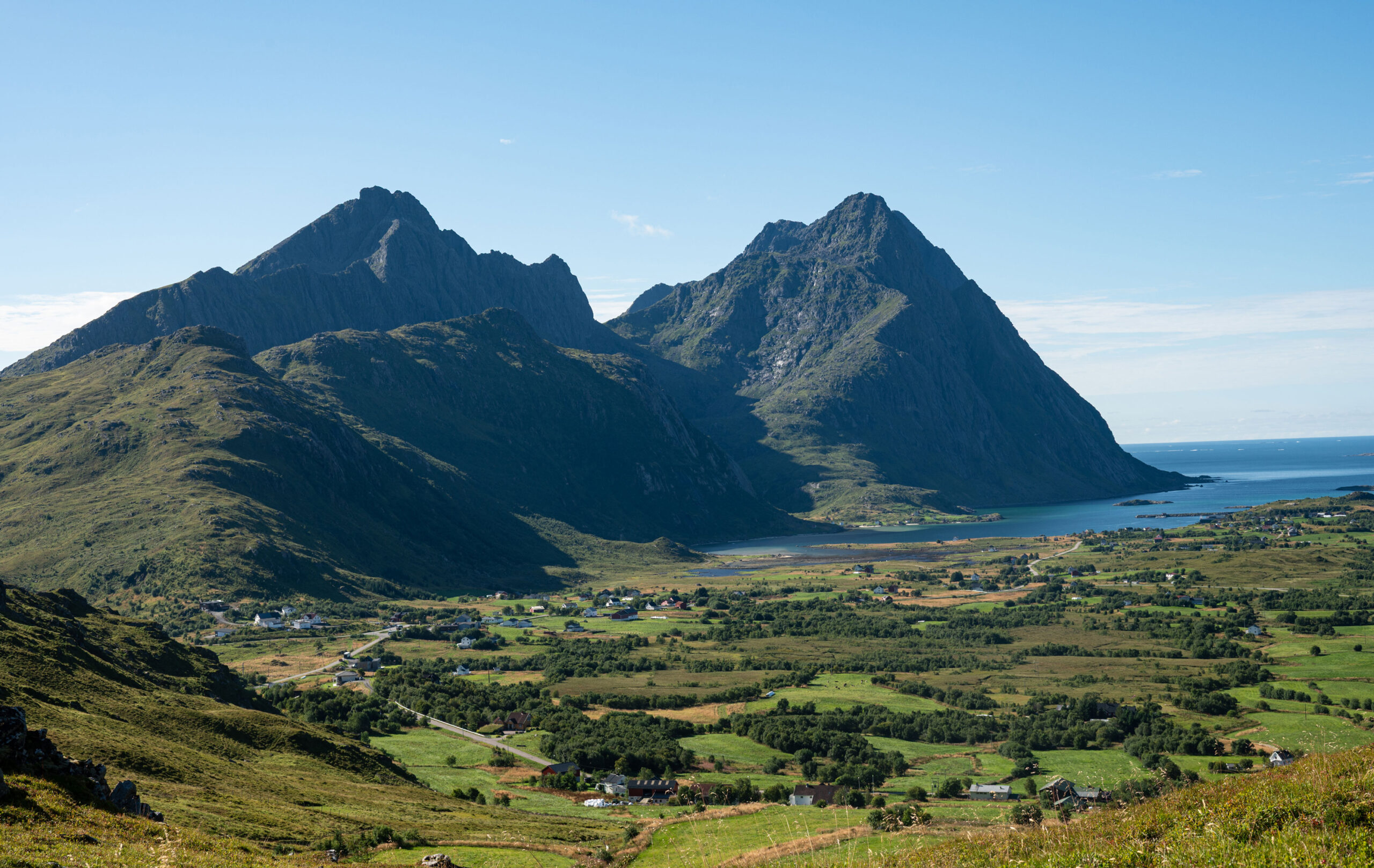 Man sieht hinunter nach Borg zum Wikinger-Museum und zur Kirche. Auf der anderen Seite präsentieren sich die beiden höchsten Berge der Insel, der Himmeltind, rechte Spitze, und der Ristind, links davon. Rund um die Hütte herum weiden Schafe.