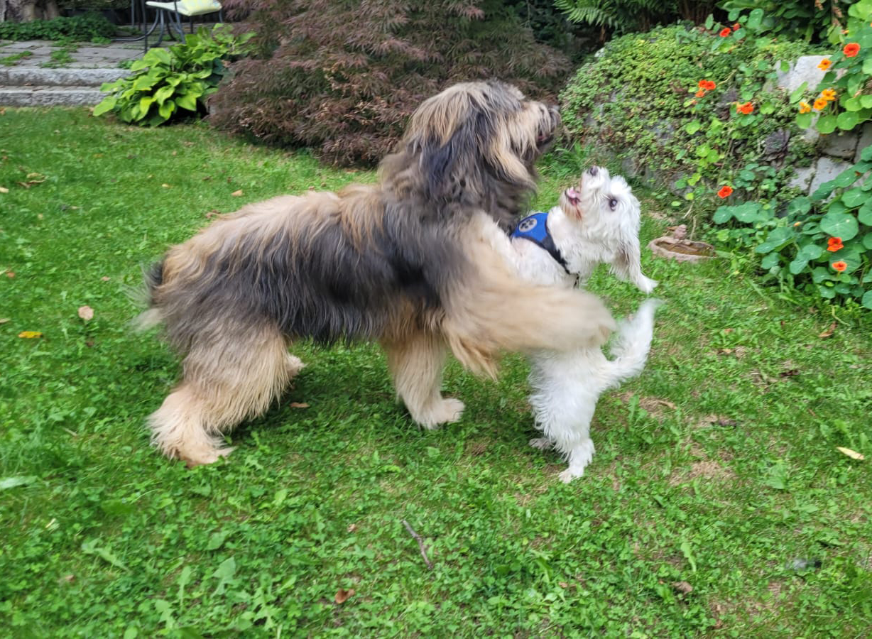 Camino ist heute früh von seinen bisherigen Gasteltern fast nach Hause zurück umgezogen, er wohnt jetzt nur zwei Häuser weiter bei einer Nachbarin. Und gleich kam seine beste Freundin Flocke zu Besuch. Wie man sieht, feiern die beiden ein sehr freudiges Wiedersehen.