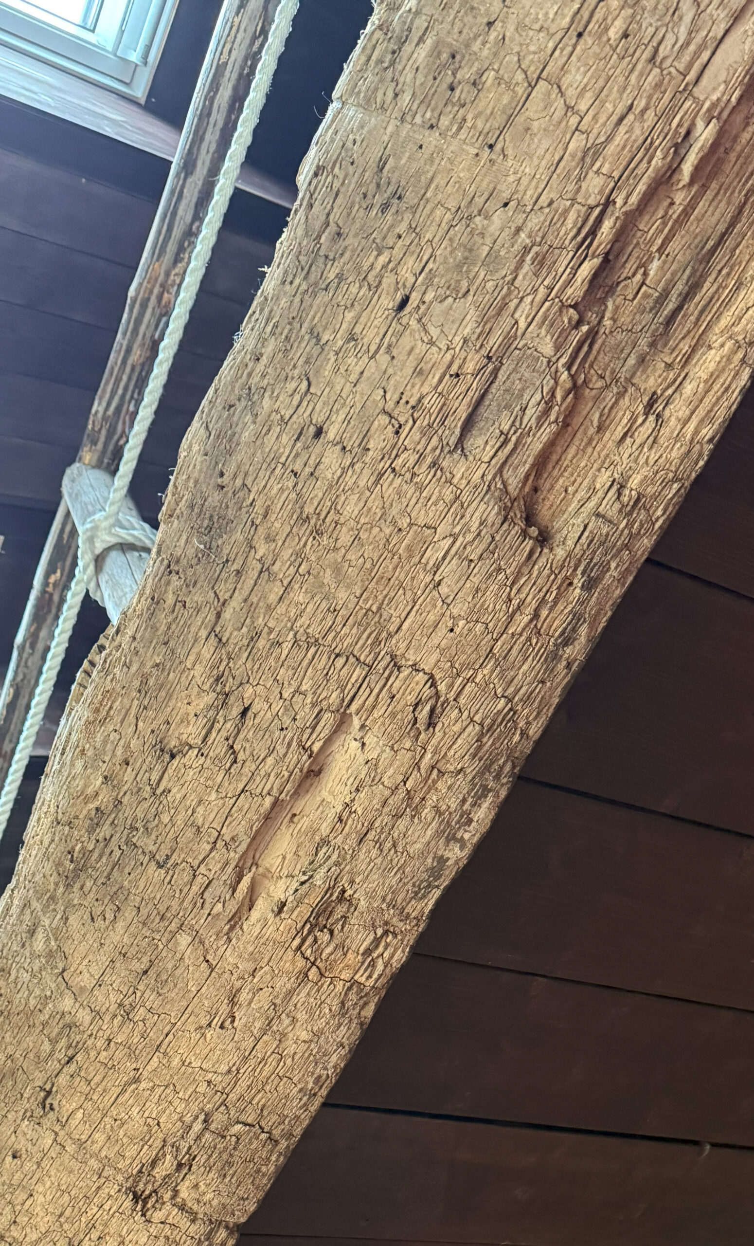 Die Brücke wird getragen von zwei Hälften eines alten, verwitterten Stammes, der ursprünglich aus Sibirien stammte, als Treibholz angeschwemmt worden war und jahrelang im Meer gelegen hatte, von Wellen und Salzwasser bearbeitet und konserviert.