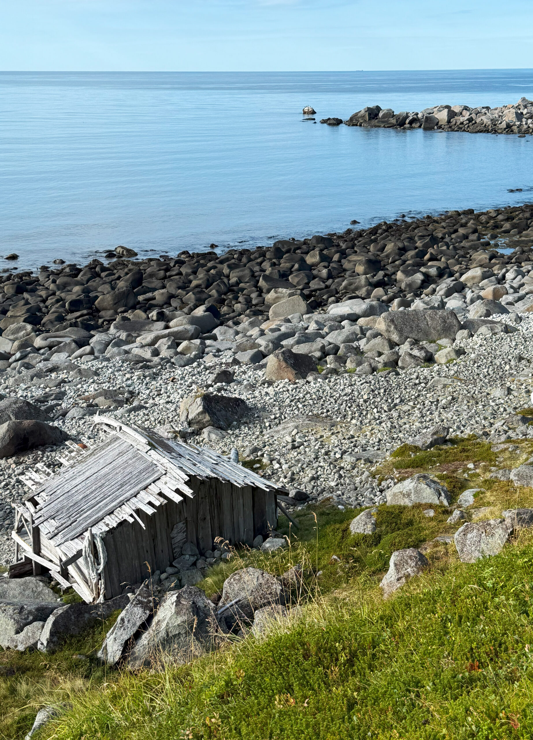 Dann ging es denselben Weg wieder zurück. An einer Stelle der Küste lagen große Balken von ausgebleichtem Treibholz. Ein schmaler, steiler Weg führte zu einer halb zerfallenen Holzhütte hinunter.